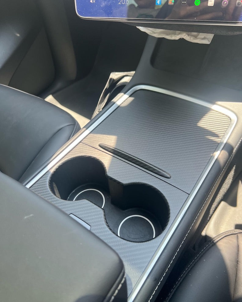 Dry carbon center console trim cover for 2021+ Model 3/Y finished in matte carbon fiber.