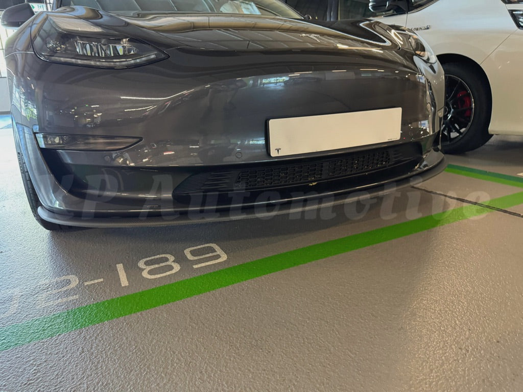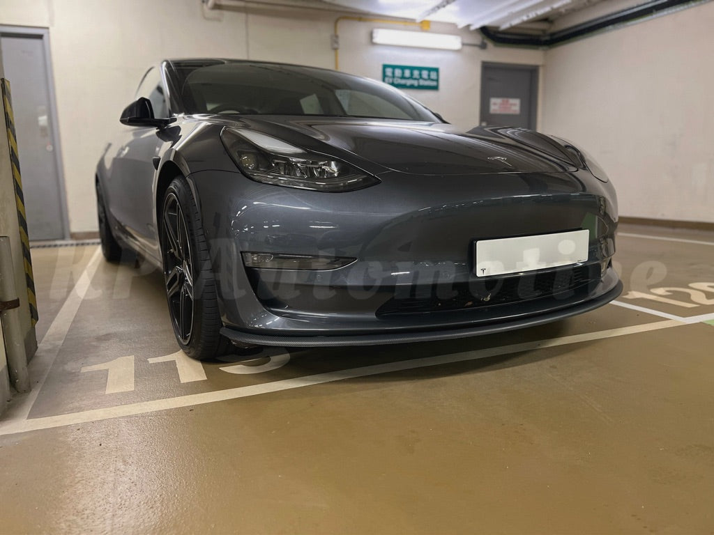Low profile front lip for Tesla Model 3 finished in glossy carbon fiber.