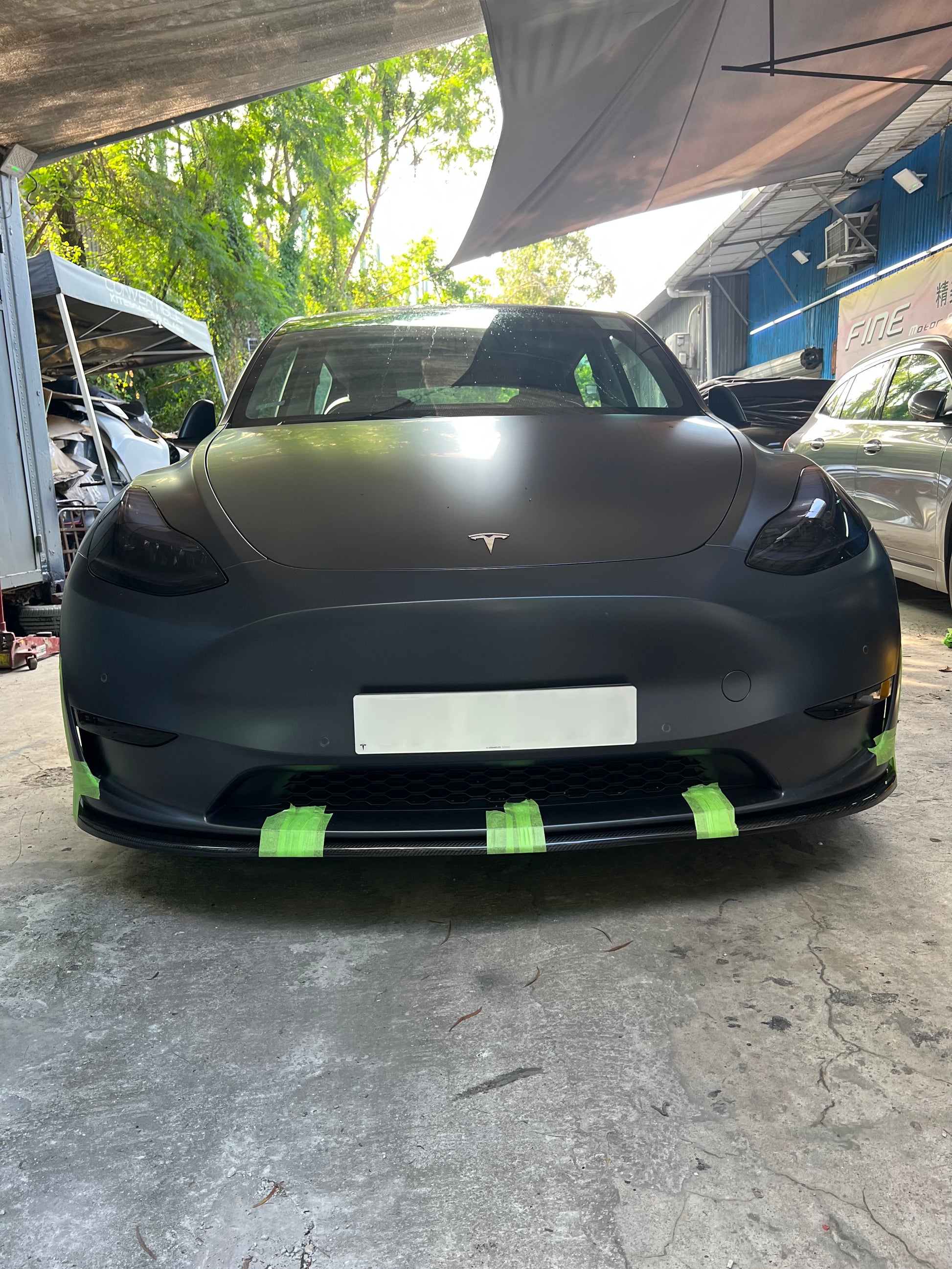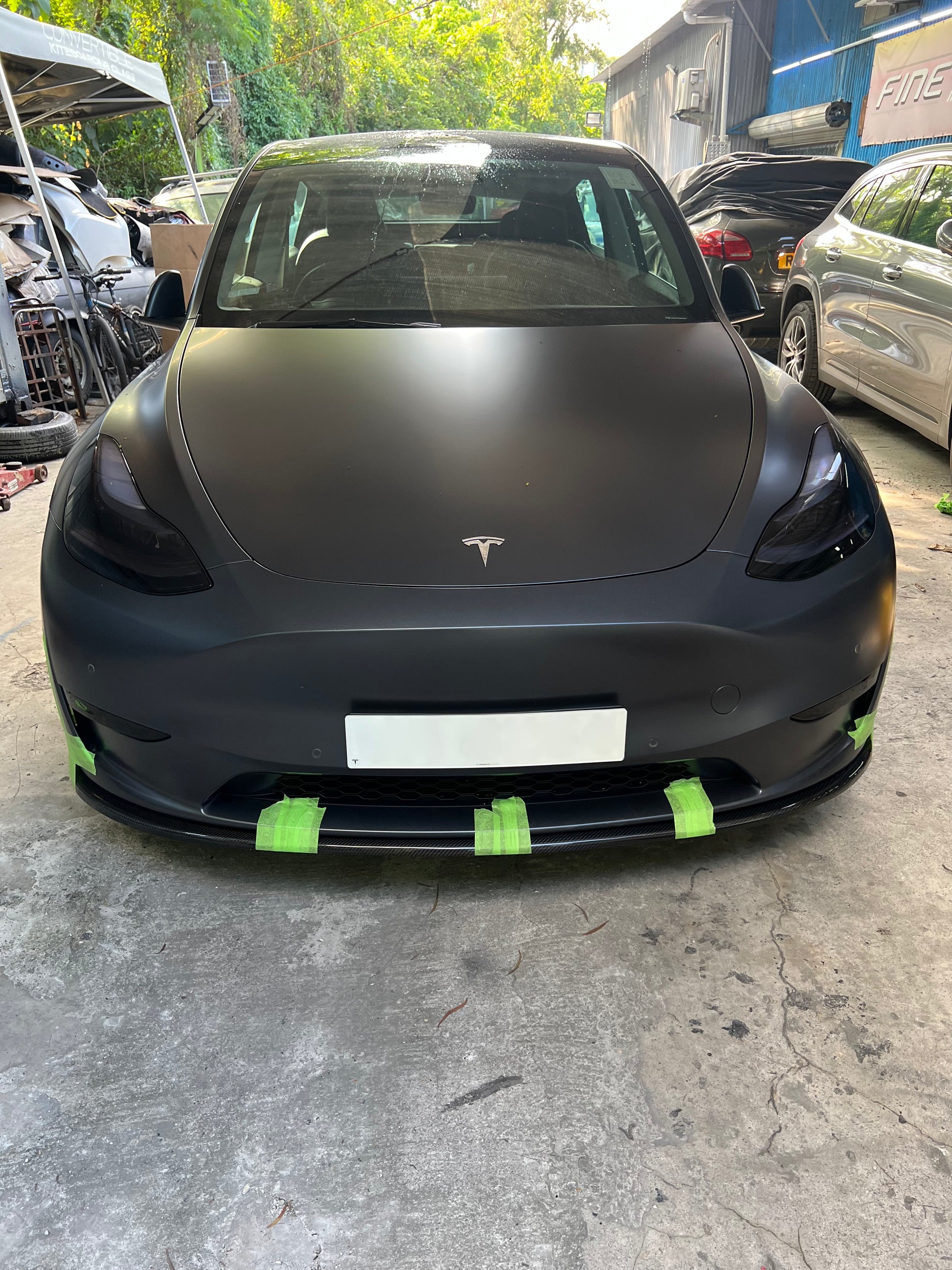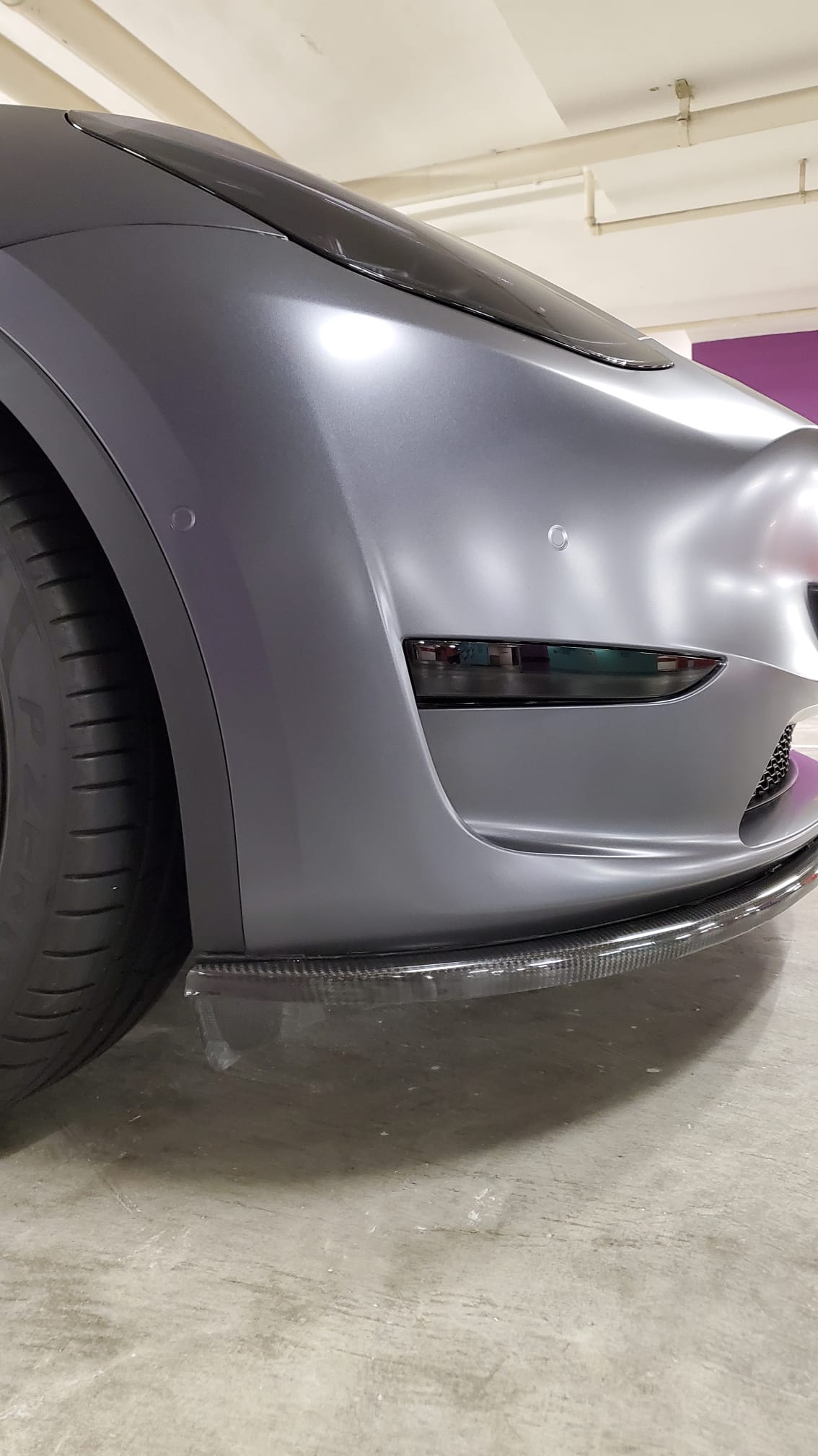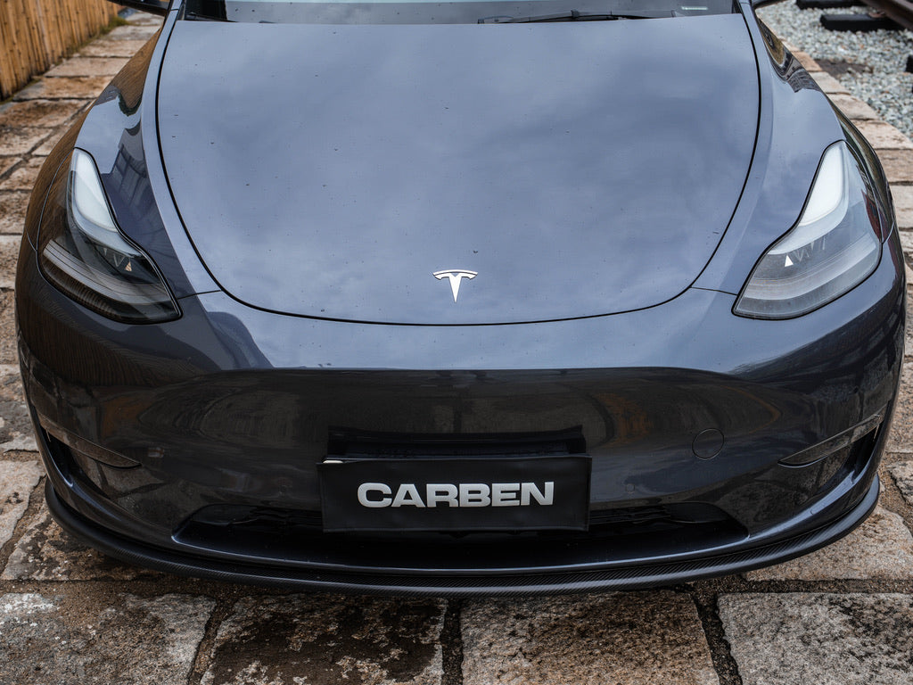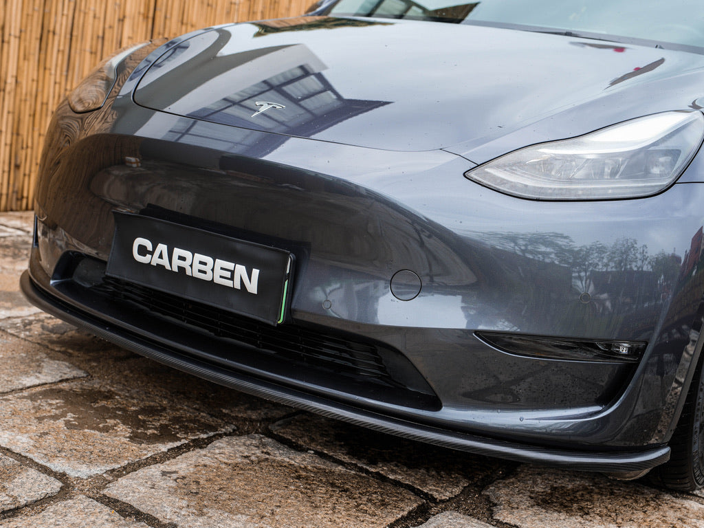 Low profile front lip for Tesla Model Y finished in glossy carbon fiber.