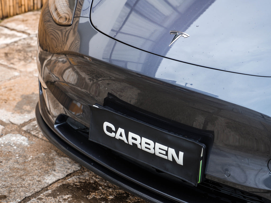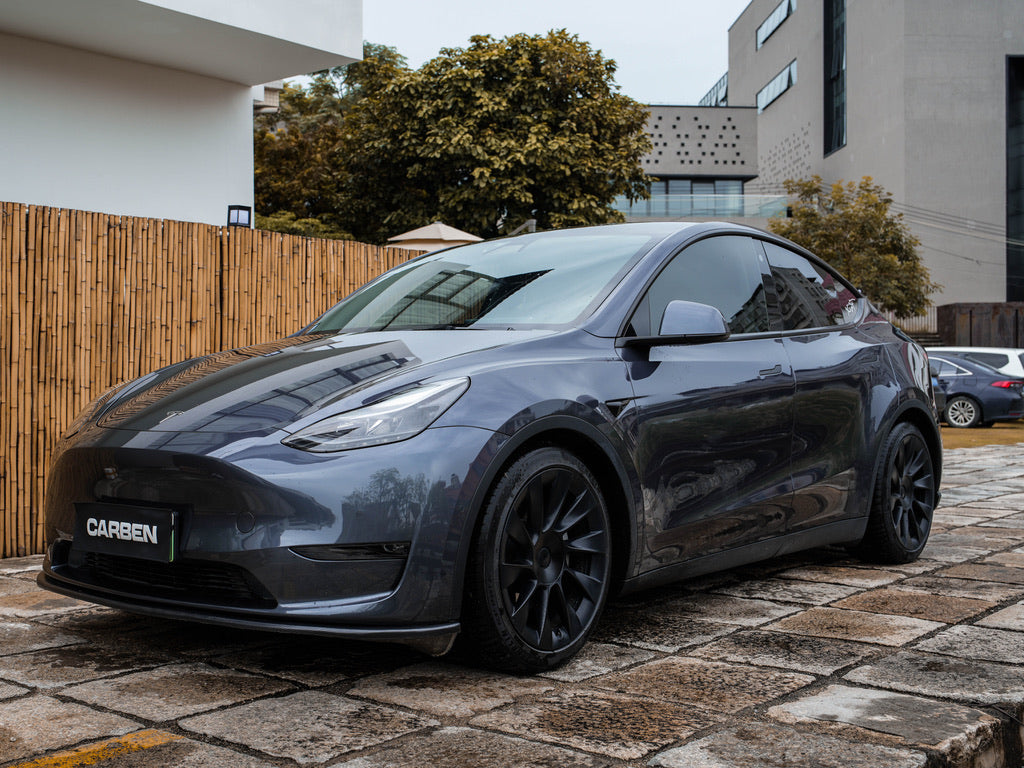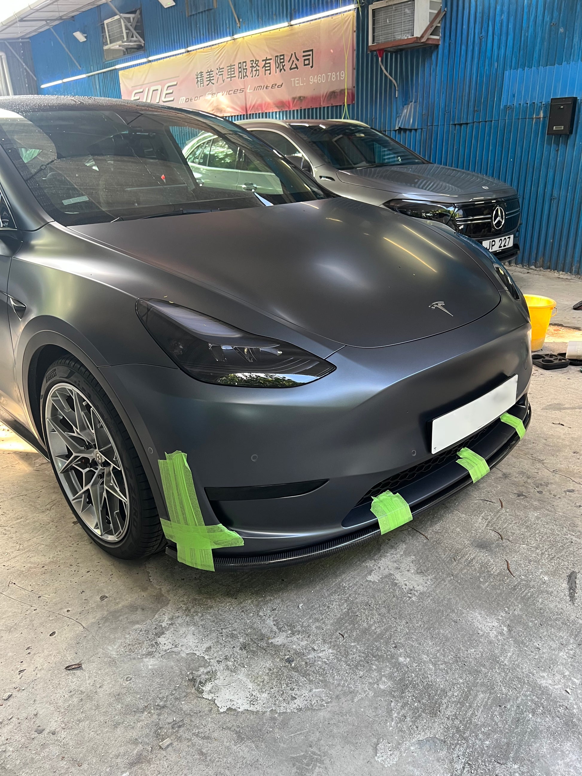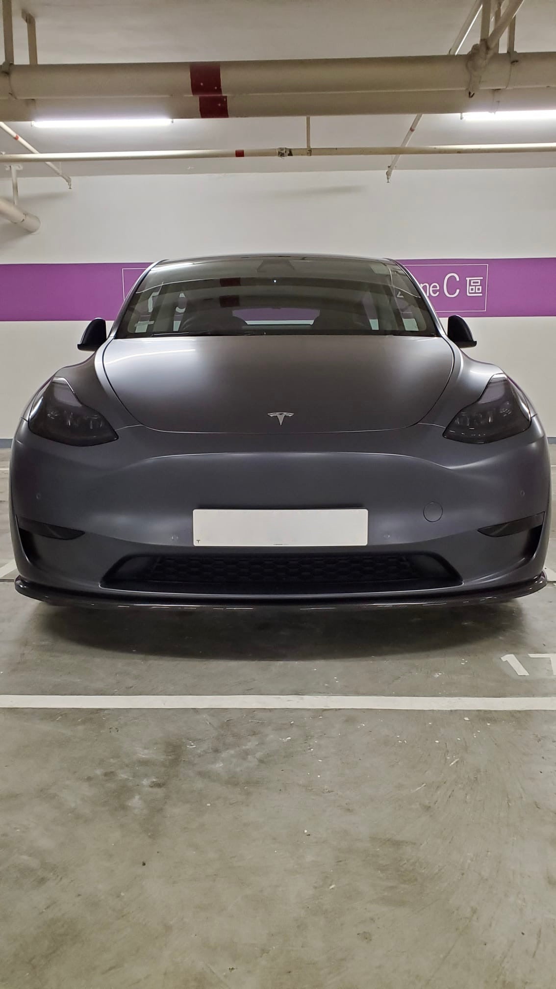 Low profile front lip for Tesla Model Y finished in glossy carbon fiber.
