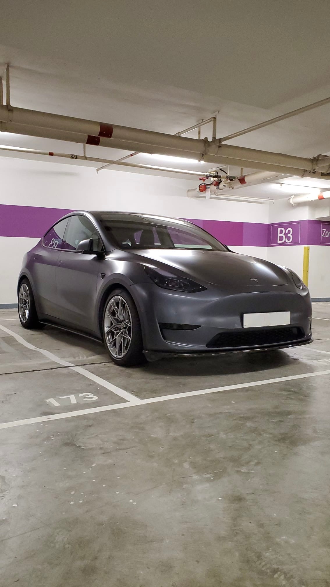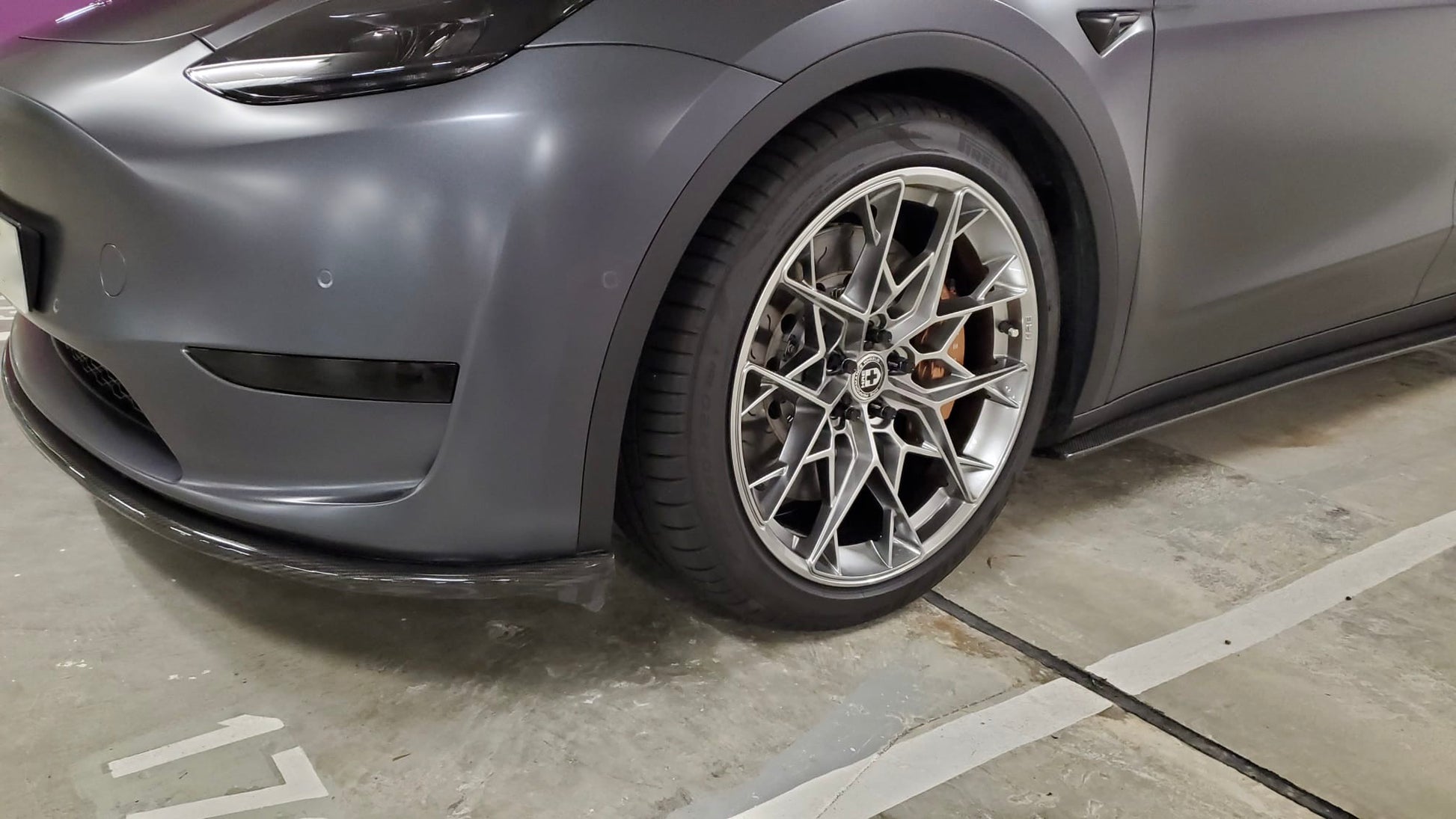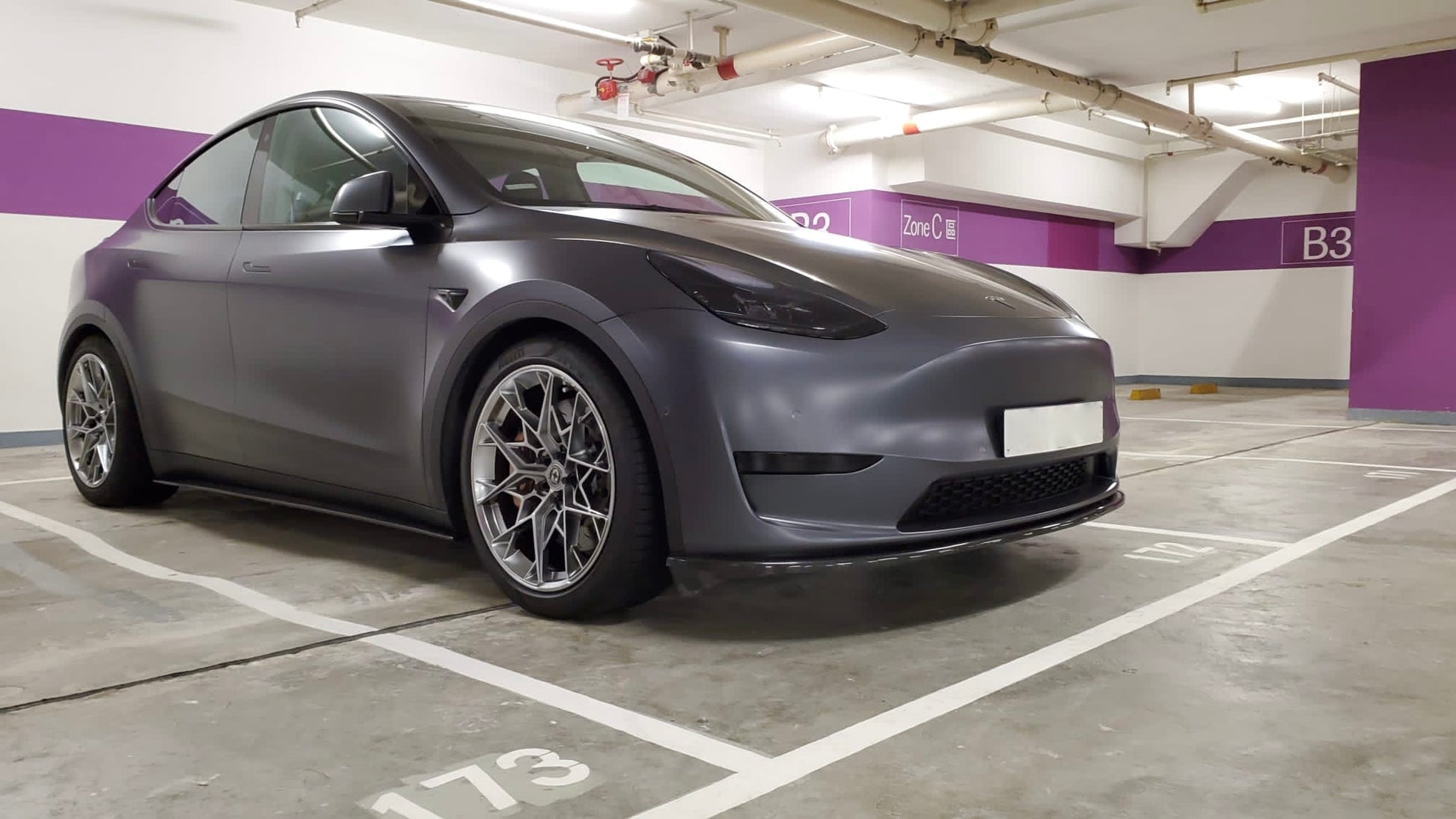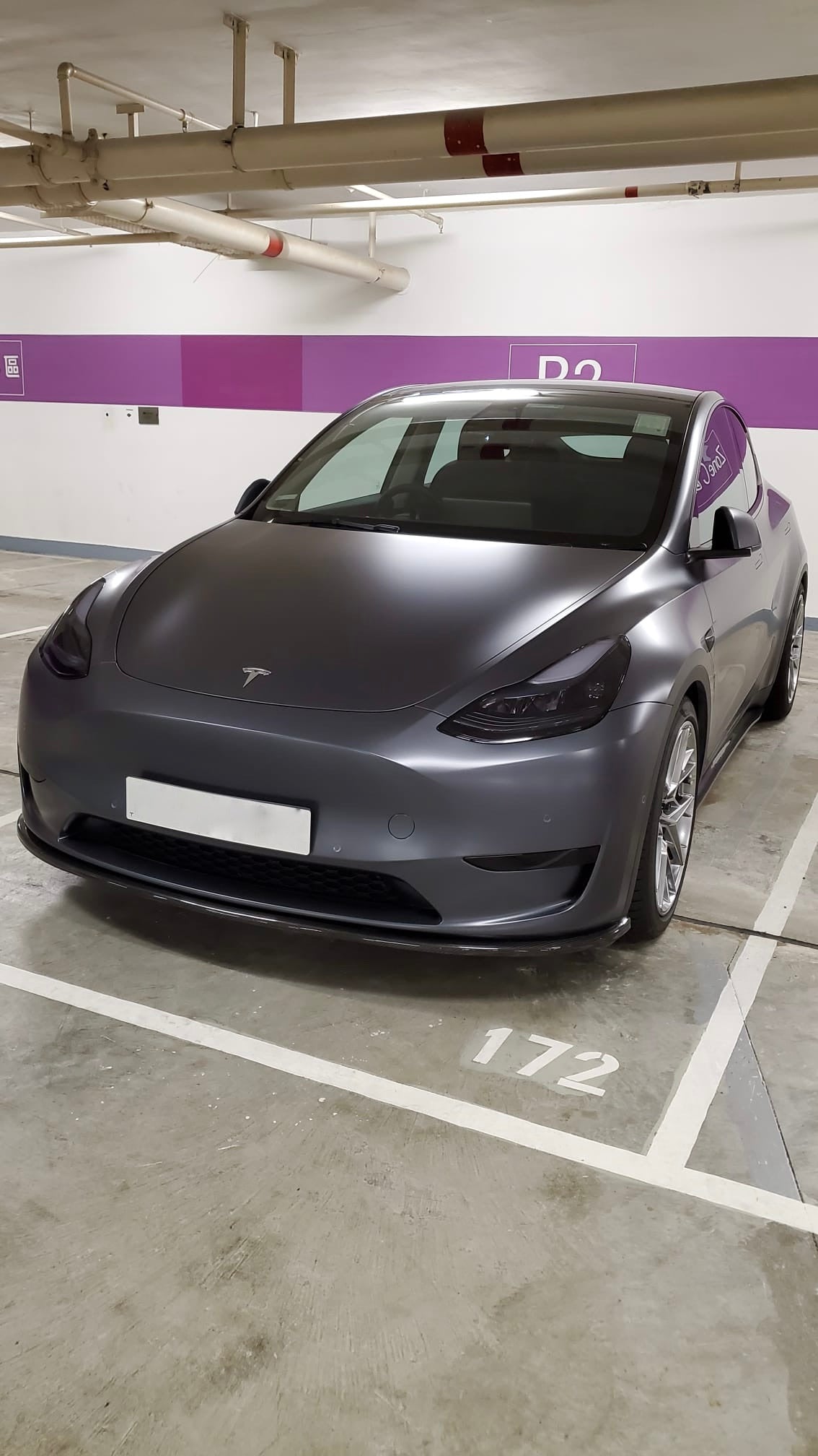 Low profile front lip for Tesla Model Y finished in glossy carbon fiber.