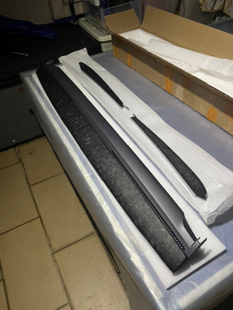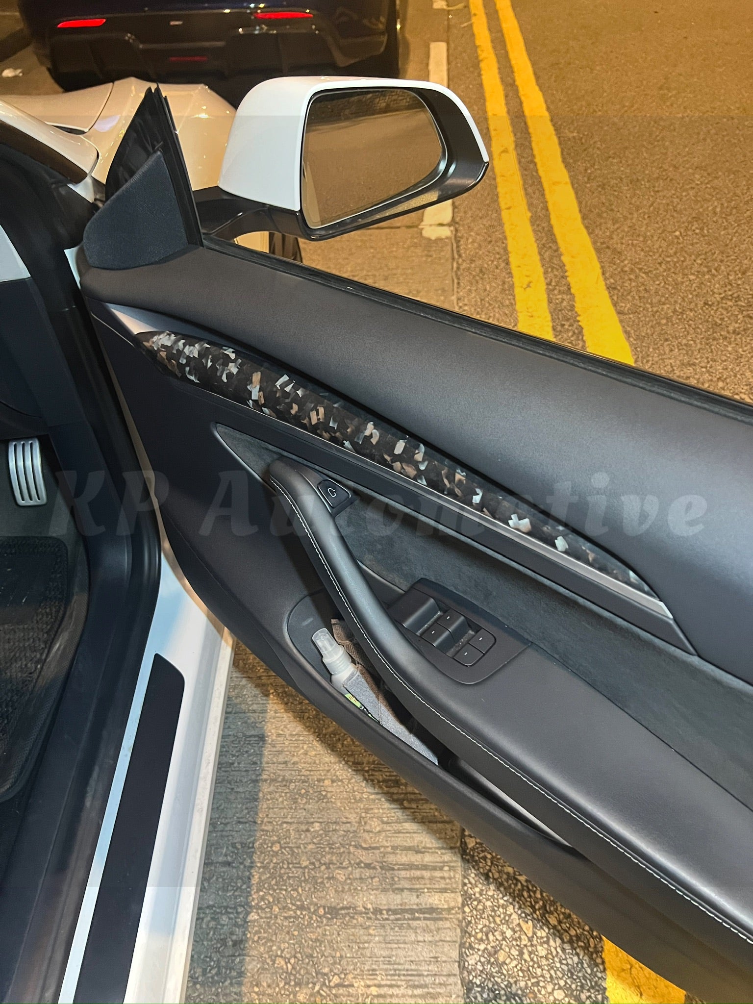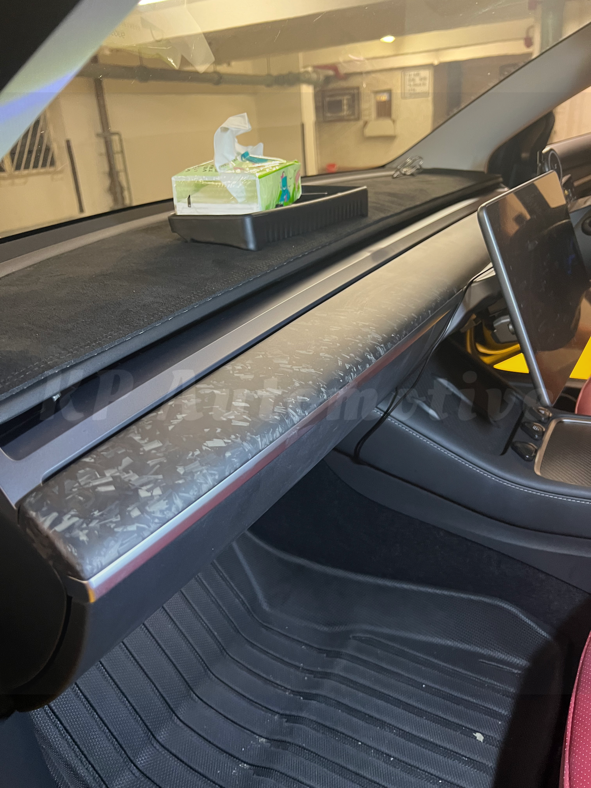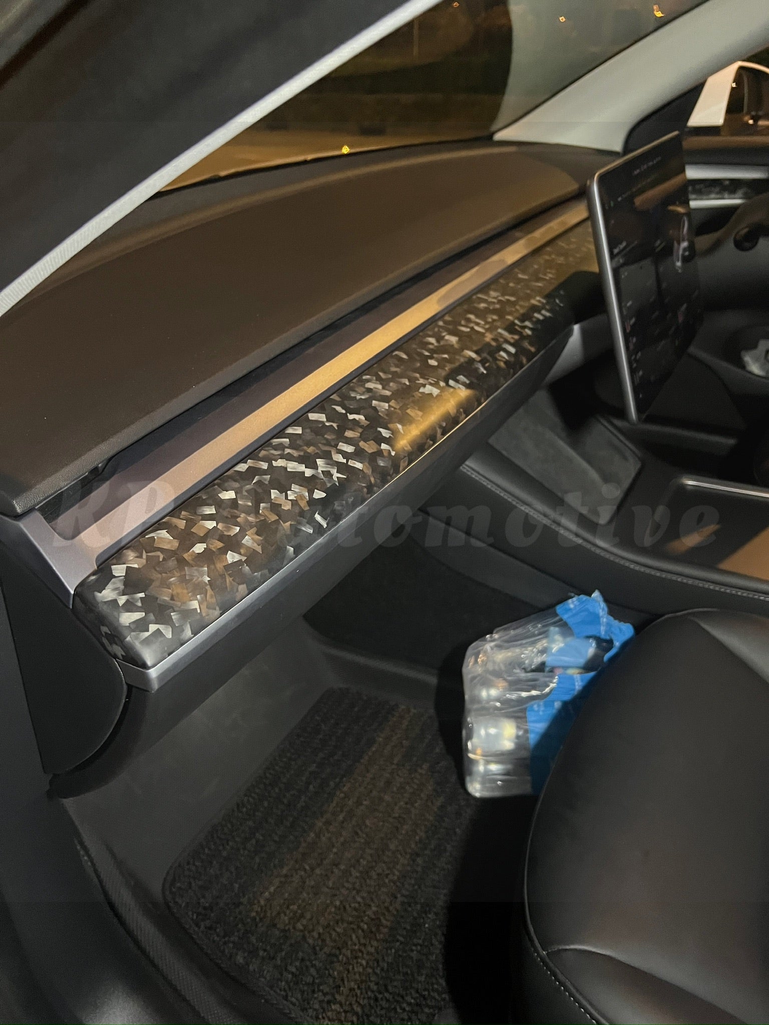 If you find the wood veneer too boring on your Model 3/Y and want something more sporty, we are now selling these replacement dashboard and front door trims finished in matte forged carbon. They are made using OEM Tesla parts and are a direct replacement for the existing dashboard and front door trims on the Model 3/Y. These are not the usual stick-on dashboard and front door covers BUT an actual direct replacement part for your Model 3/Y with real carbon fiber in place of the wood veneer.