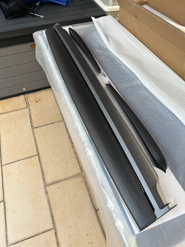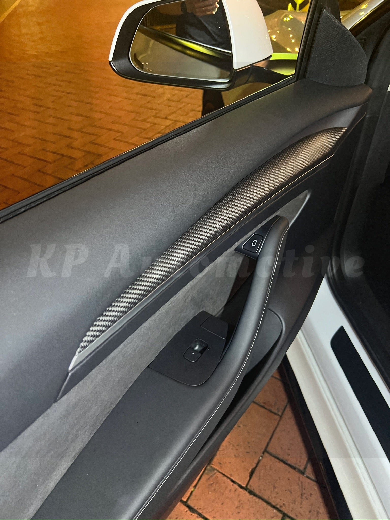 If you find the wood veneer too boring on your Model 3/Y and want something more sporty, we are now selling these direct replacement dashboard and front door trims with a 3D Dry Carbon Fiber finish. This is a unique finish with a textured feel and a matte finish. They are made using OEM Tesla parts and are a direct replacement for the existing dashboard and front door trims on the Model 3/Y. These are not the usual stick-on dashboard and front door covers BUT an actual direct replacement part for your Model 3/Y with real carbon fiber in place of the wood veneer.
